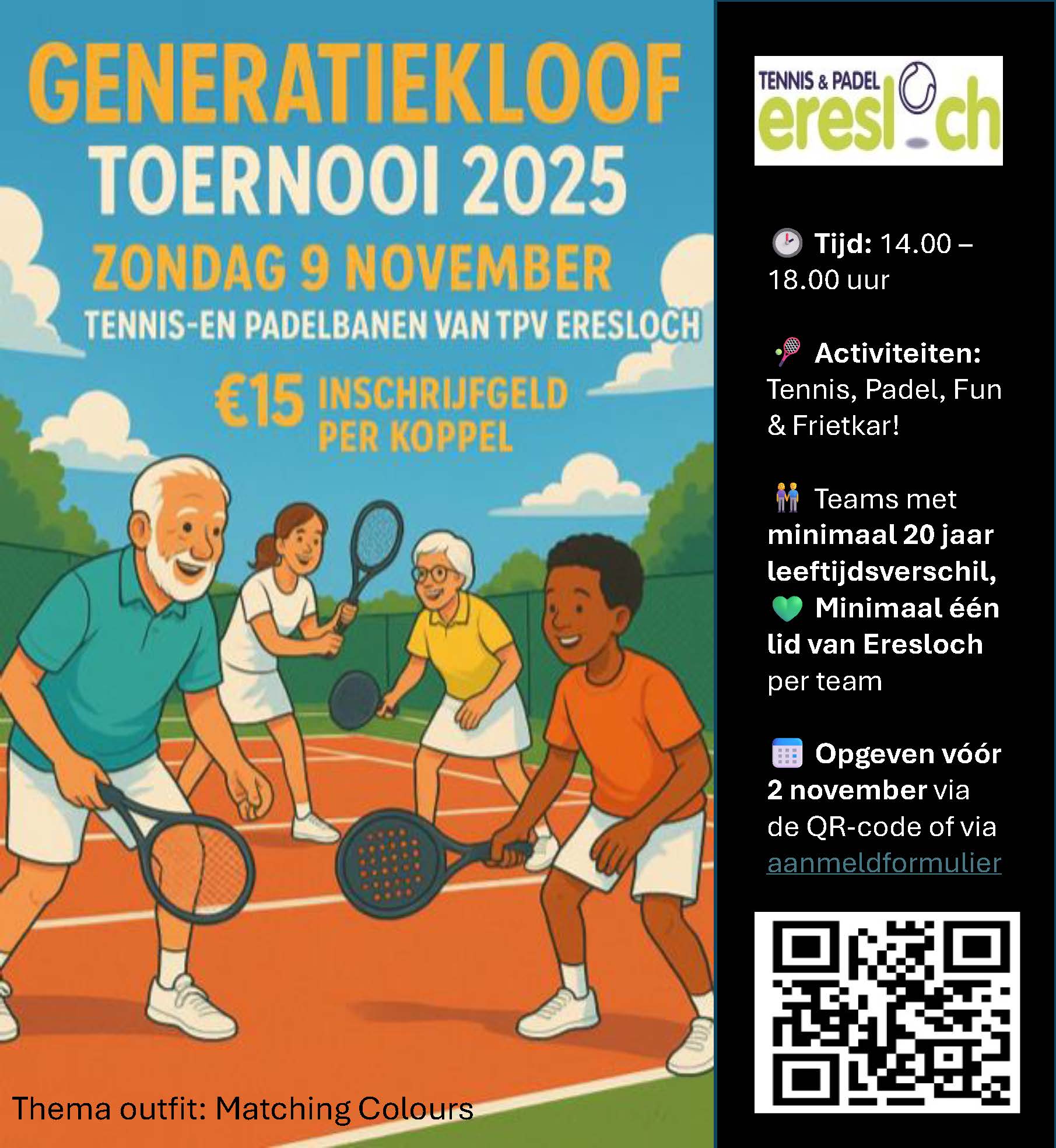 Op zondag 9 november organiseren we weer het Generatieklooftoernooi bij TPV Eresloch!