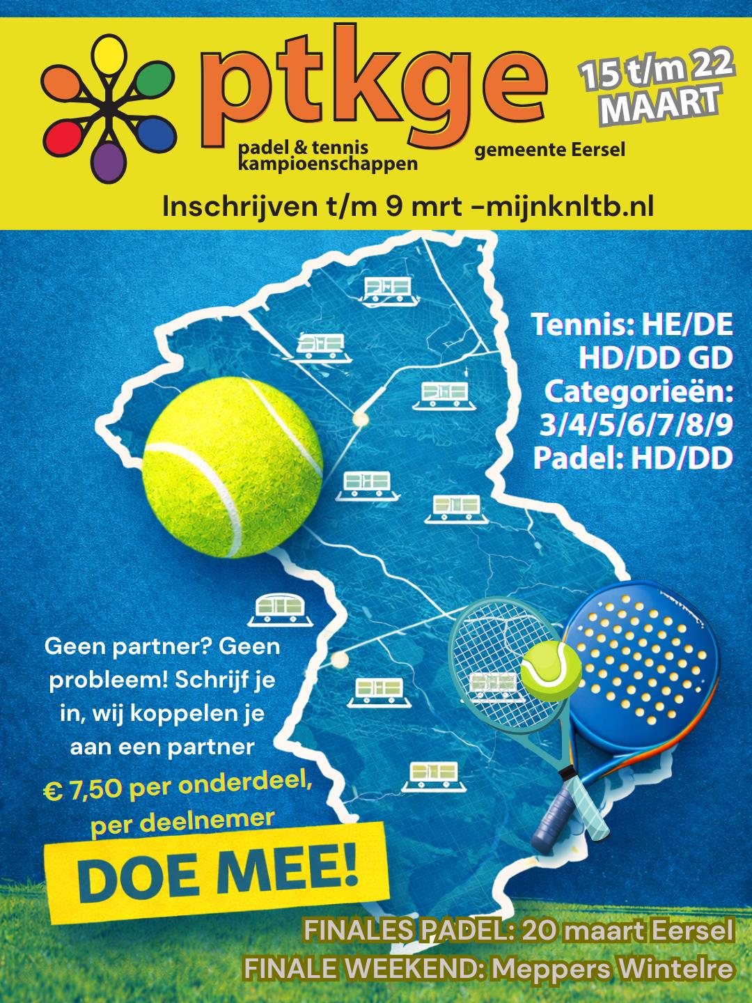 Van 15 t/m 22 maart vindt het PTKGE – Padel & Tennis toernooi van de gemeente Eersel plaats. Een sportieve week vol spannende wedstrijden, gezelligheid en fanatieke rally’s. Doe jij ook mee?